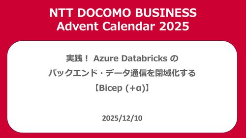 この記事は、NTT docomo Business Advent Calendar 2025 10日目の記事です。 Microsoft の IaC 言語である Bicep (+ Azure CLI/Databricks CLI) を使って、Azure Databricks ワークスペースをデプロイし、そのバックエンド通信や Azure データサービスへの通…