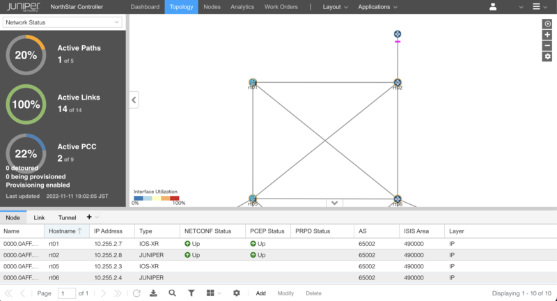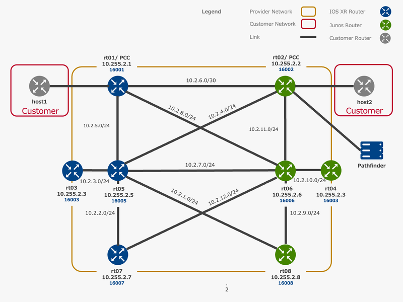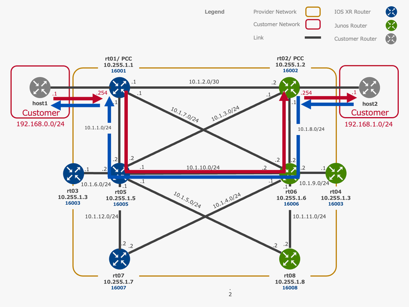 イノベーションセンターの竹中です。 本記事では私たちの検証環境において様々な PCE 実装を用いた SR Policy の発行方法を検証します。 4 つの PCE の検証手順を各章で記載しますが、それぞれの PCE の環境準備手順と初期設定、PCC との間で PCEP Session を確立するまでの設定は省略します。 つまり PCE と PCC 間で PCEP Session が確立した状態から、特定の経路を指定する SR Policy の発行と確認、さらに VPN 通信で当該経路が使用されていることを確認します。