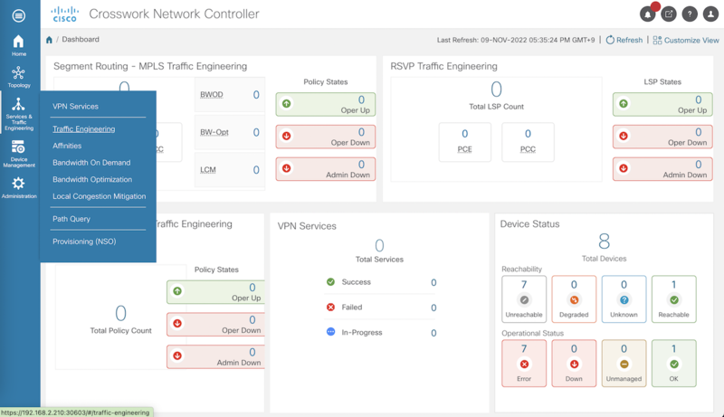 CNC は Cisco 社が提供する PCE を含むソフトウェアスイートであり、GUI でトポロジーの確認や SR Policy などのパス情報の管理ができます。