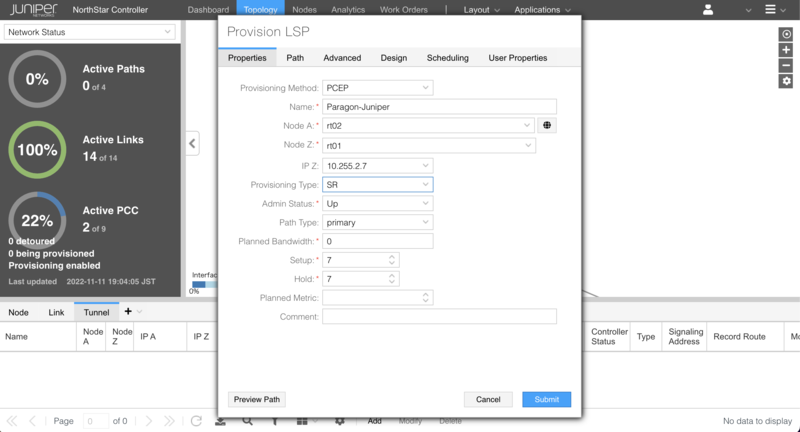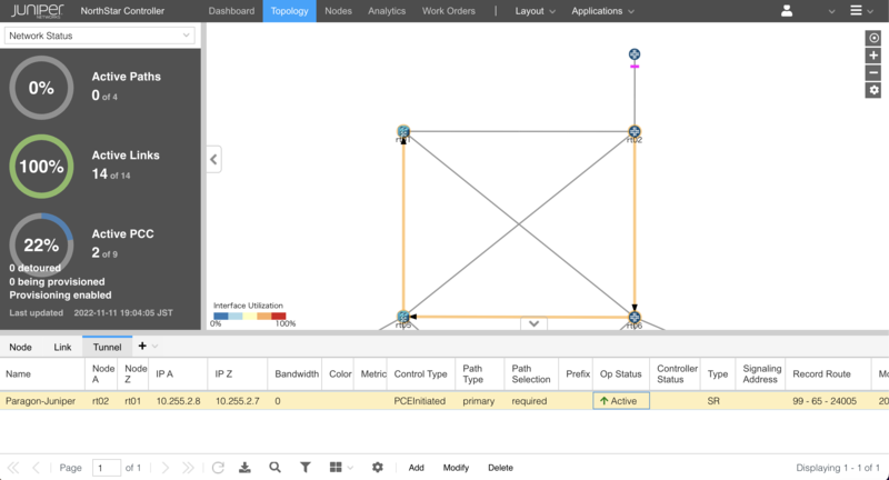 IOS XR SR-PCE と同様に、現在(2022 年 11 月)CNC は SR Policy の Color の指定を Vendor Information object 内で Cisco 社独自実装の PCEP TLV を用いて行っています。 Junos PCC では当該 TLV を解析できないため、rt02 を PCC とした検証は省略しています。