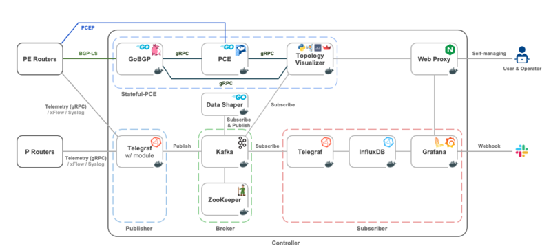 また Pola PCE のデーモンが gRPC インターフェースを提供しているため、デーモンを中核として、例えば以下のような高機能なネットワークコントローラを構築することも可能です。