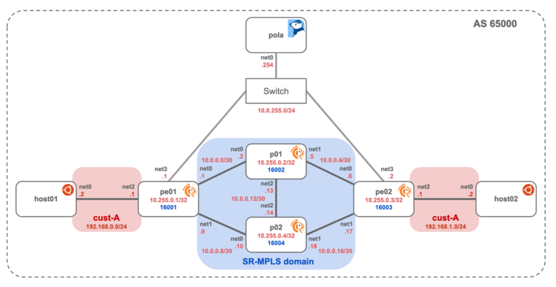 user@server:~$ cd pola/examples/sr-mpls_l3vpn/ user@server:~/pola/examples/sr-mpls_l3vpn$ tinet upconf | sudo sh -x