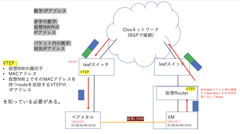 MACアドレスなどの情報をEVPNで交換したのち、VXLANでL2トンネルを作ることによって、L2接続性を実現しています。