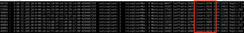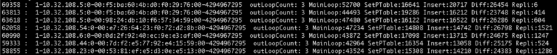 この写真は経路複製をする関数の中の部分ごとの処理時間を出力したものです。 印をつけた部分が複製先EVPNテーブルを選定して該当するテーブルをリストに挿入している操作なのですが、コード改善後に処理時間が大幅に短縮されていることが分かります。