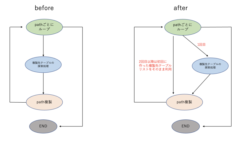 ですが同じrouteに属するpathは(自分が検証環境でチェックした限りでは)複製先テーブルは同じであったため、ここの処理を1つにまとめることで、性能改善ができるのではないかと考えました。