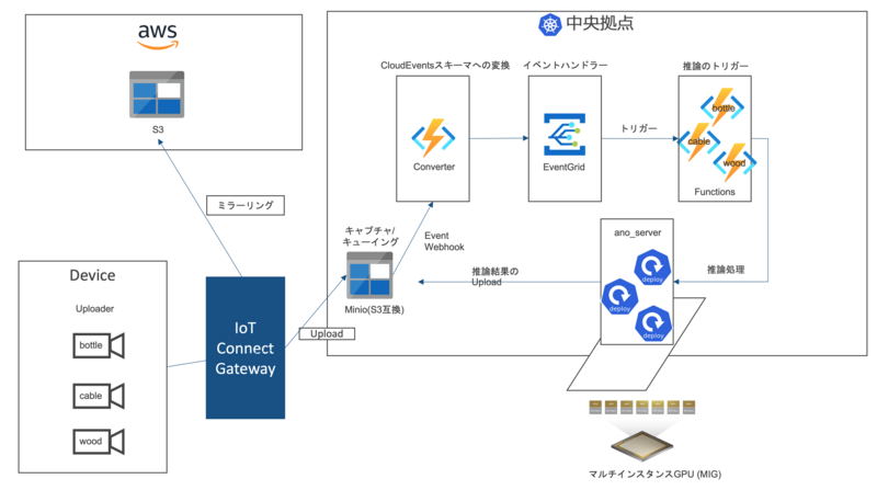 概要として、以下のような画像イメージを想定してPoCを構築した形となります。 ユースケースとしては、製造業などの各拠点に点在する拠点から、部品(ネジ/カメラ/カプセル/etc.....)の故障検知のアーキテクチャを作成しました。