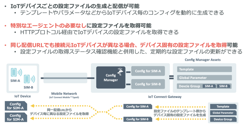 コンフィグマネージャーは、IoTデバイスごとの設定ファイルの生成と配信ができる機能です。IoTデバイス毎の設定ファイルの生成および配信設定は、ポータル上から簡単に行えます。